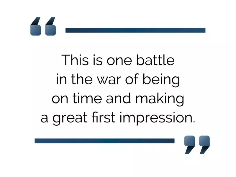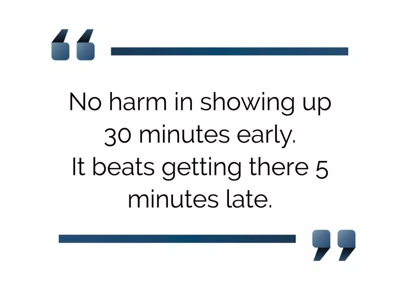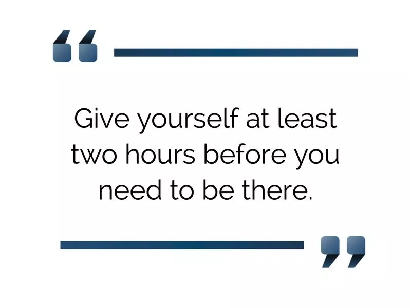 Yes, you may be able to get ready in 20 minutes and be stuck staring anxiously at the clock for the next 1 hour and 40 minutes, but in the off chance something goes awry, you’ll be thankful you had that spare time.