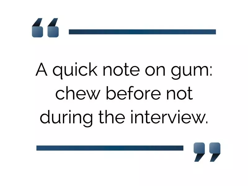 A quick note on chewing gum: Yes, chomp away before the interview because bad breath makes a terrible first impression. But do not chew it during the interview. Either swallow it (sorry grandma, it’s OK to swallow gum) or toss it in the trash before meeting the interviewer.