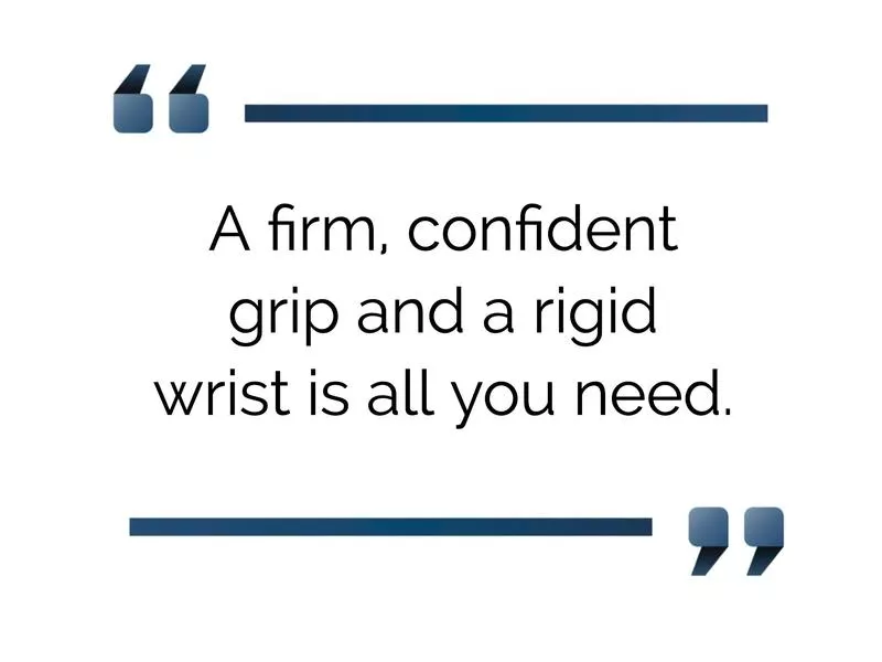 A firm, confident grip and a rigid wrist is all you need — don’t leave the manager crippled from your death grip. This will make it hard for him or her to sign your paycheck after you get the gig.
