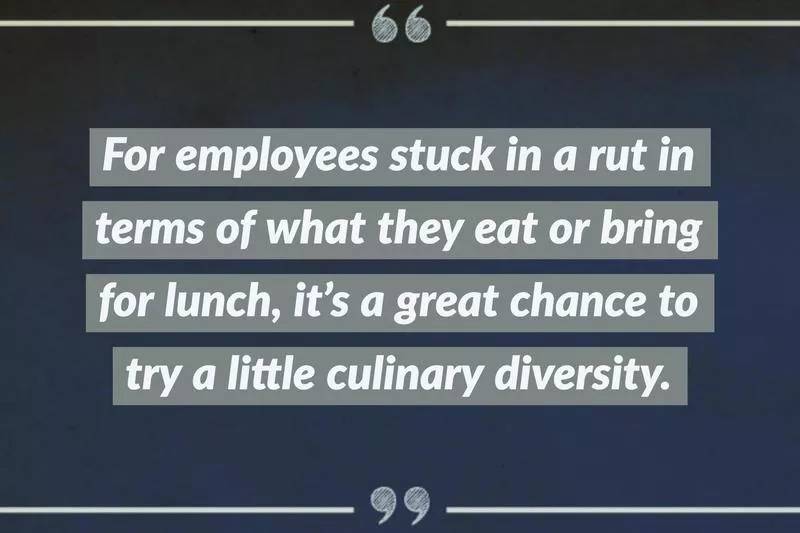 Again, it’s a great chance to get employees mingling, and an awesome way to show gratitude for their work. For employees stuck in a rut in terms of what they eat or bring for lunch every day, it’s a great chance to try a little culinary diversity.