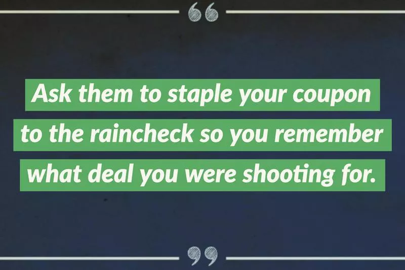 So, you didn’t take my advice on getting there early or someone was just a few seconds earlier than you and left the shelf empty. Don’t fret, just hit up the customer service desk and kindly request a raincheck. Also ask them to staple your coupon to the raincheck so you remember exactly what deal you were shooting for when the item is back in stock.