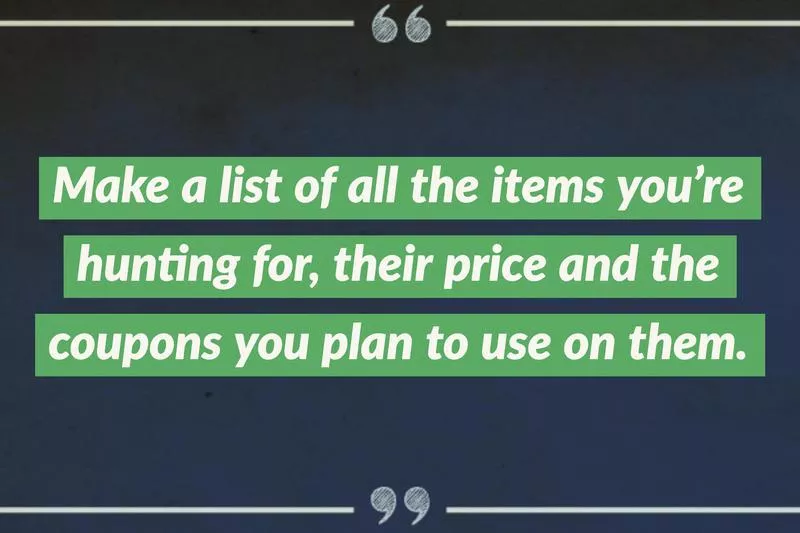 Never walk into the store blind. Make sure you make a list of all the items you’re hunting for, their price and the coupons you plan to use on them. After writing it all down, tally it up and put the total on the bottom of your list.