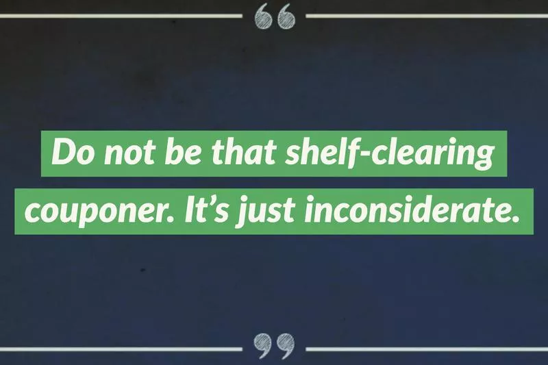 Piggybacking off the binder issue, you also have to be an organized couponer to make the entire transaction silky smooth. Before heading to the register, find an aisle with no one in it — the magazine aisle was generally my go-to spot — and take the time to put all your coupons in order. Group them by product and separate the manufacturer coupons from the store coupons. When you hand these well organized coupons to the cashier, it’ll brighten their day just a bit.