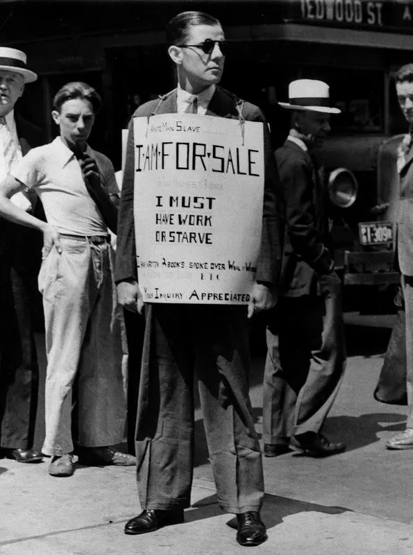 In this photo, 30-year-old Robley D. Stevens wears a sign that reads: "I am for sale. I must have work or starve," while standing on a sidewalk in Baltimore, Maryland in August 1931.