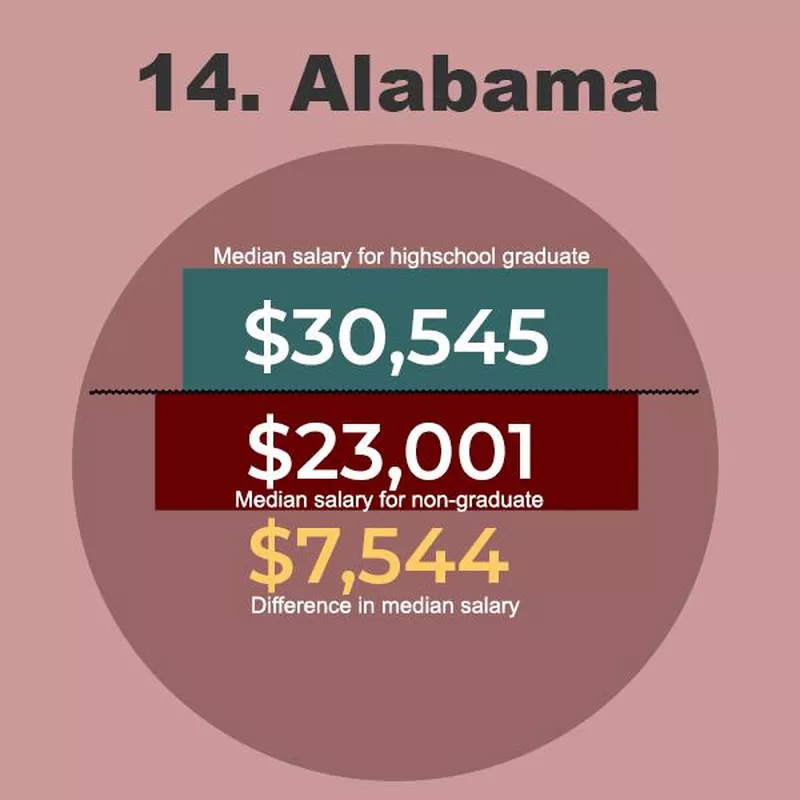 This may explain the wide gap between the salaries of people with and without a diploma. As the seventh poorest state, Alabama offers low wages for non-graduates.