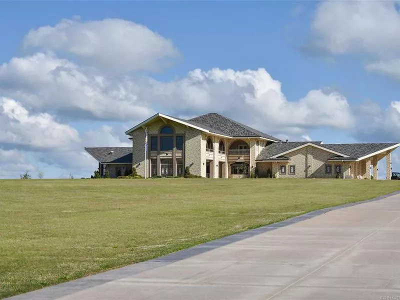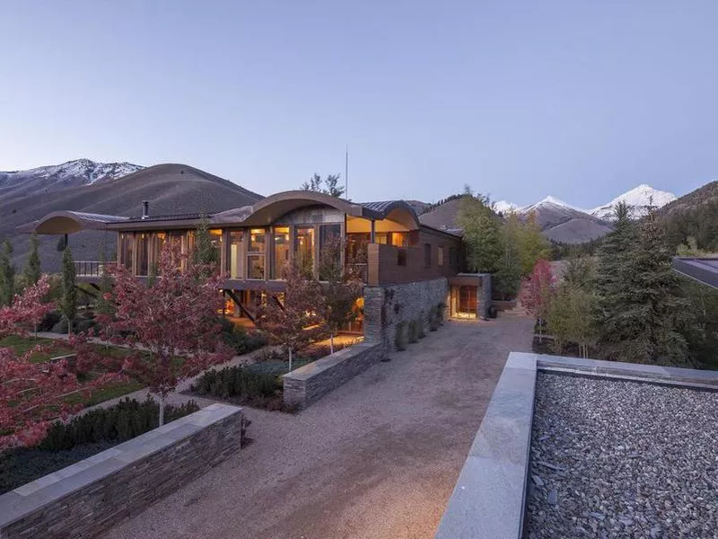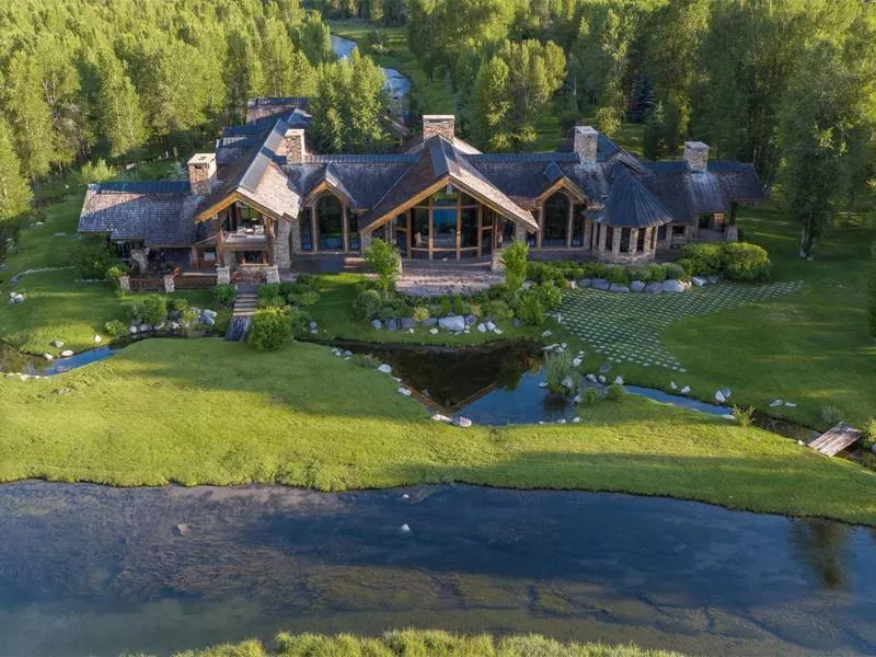 Special features: Riverside ranch with soaring 30-foot ceilings, massive bar, giant two-island kitchen, walnut flooring, custom iron work, floor-to-ceiling fireplaces, two-story library and a master suite with an octagon-shaped office.