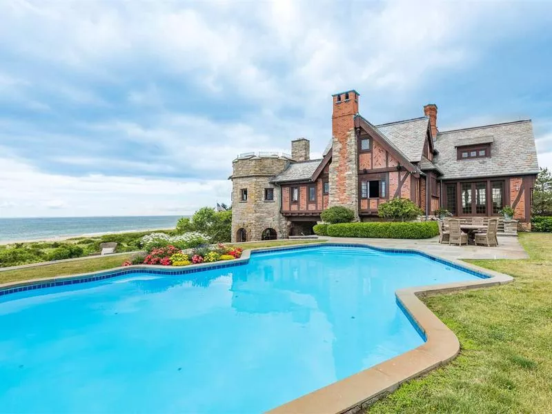 Special features: Mammoth 1920s Tudor estate with 900 feet of Atlantic Ocean beach front, with two guest houses, outdoor kitchen, tennis court, pool and an impressive two-story great room with indoor balcony.