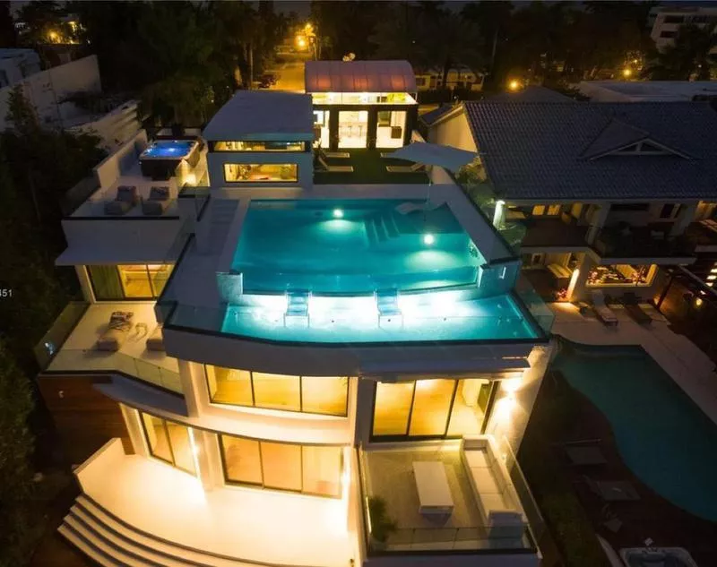 Special features: Rooftop deck and pool, steam shower, glass elevator,  modern wet bar, theater,  waterfront dock, downtown Miami views.