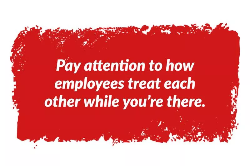 If you’re treated in a way that’s dismissive, that could be a red flag. Pay attention to how employees treat each other while you’re there as well. A culture that doesn’t promote mutual respect is likely to offer you a toxic work environment — and you don’t want any part of it.