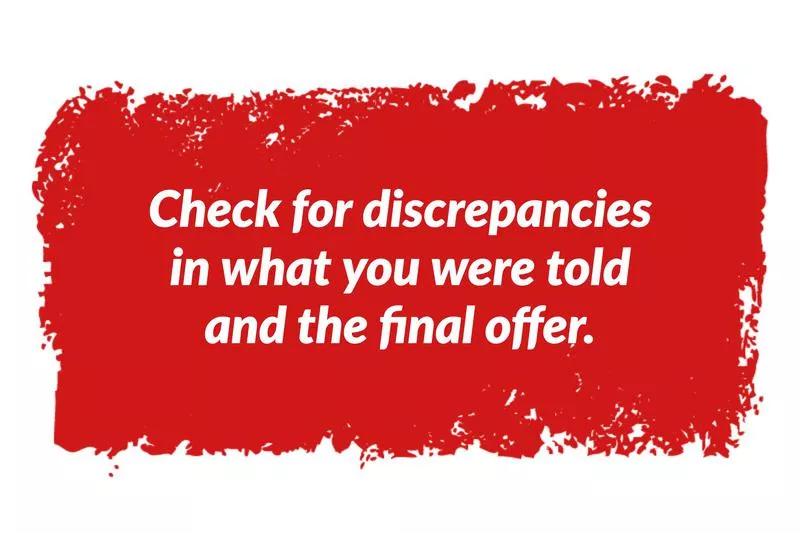 Do your notes show that the interviewer mentioned 14 days of paid vacation, but when you get your offer, there are only 10 days of paid vacation? Check for discrepancies in what you were told and the final offer. If the terms keep changing, you can’t be sure that the employer will honor its promises.