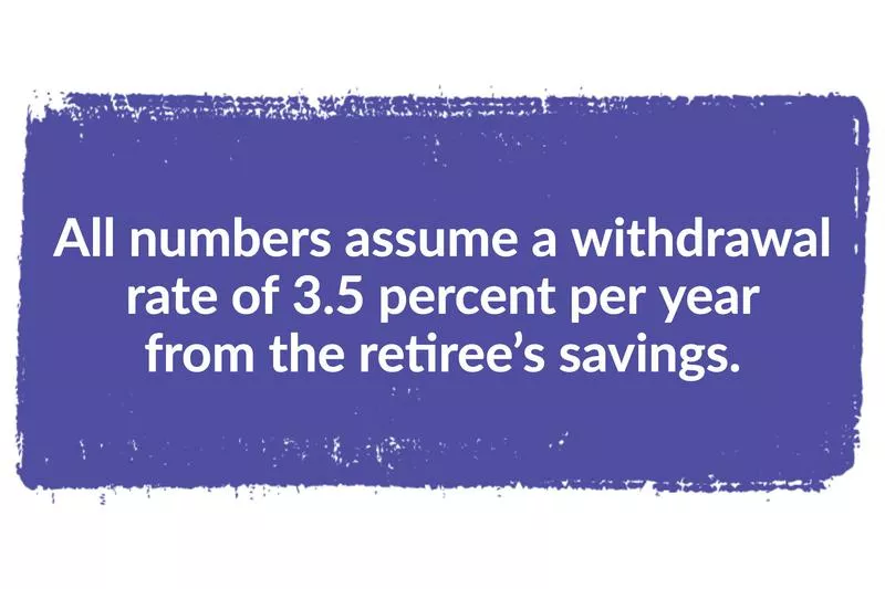Many variables are at play, so let’s set up the ground rules. First, all numbers assume a withdrawal rate of 3.5 percent per year from the retiree’s savings, which amounts to $1,458 per month. Sure, the 4-percent rule is great, but today’s low interest rates do not support it. The last thing you want to do is run out of retirement savings in your 70s or 80s.