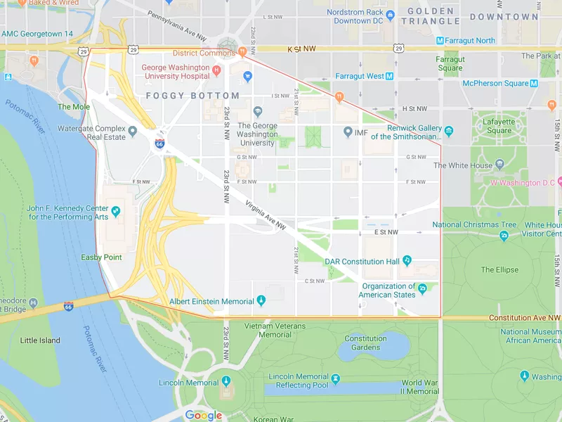 Real estate glimpse: Foggy Bottom is a pretty wealthy neighborhood with mostly apartments. The median listing price is $600,000 according to realtor.com, and more upscale apartments list for several million. In 2017, Foggy Bottom was named the most expensive place to rent in D.C., with the median two-bedroom apartment renting for $4,620 per month.