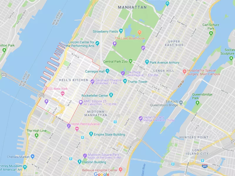 Real estate glimpse: The highest-priced priced condo currently listed in Hell’s Kitchen is a 15,000 square-foot, 10-bedroom one that’s listed for $85 million. A one-bedroom, 648-square foot co-op is selling for $430,000.