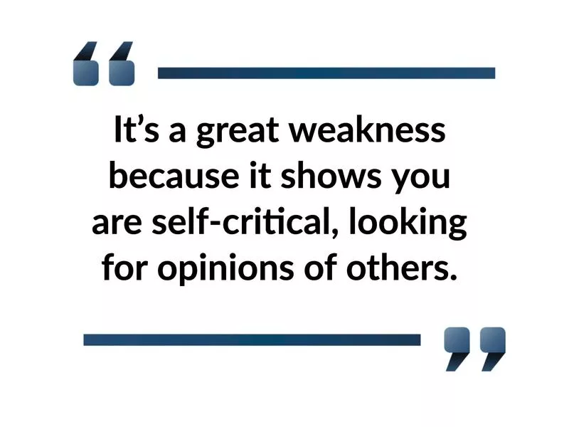 It’s a great weakness because it shows you are self-critical, looking for opinions of others, and that if you were about to make the wrong decision, it would be caught by management before it happened."